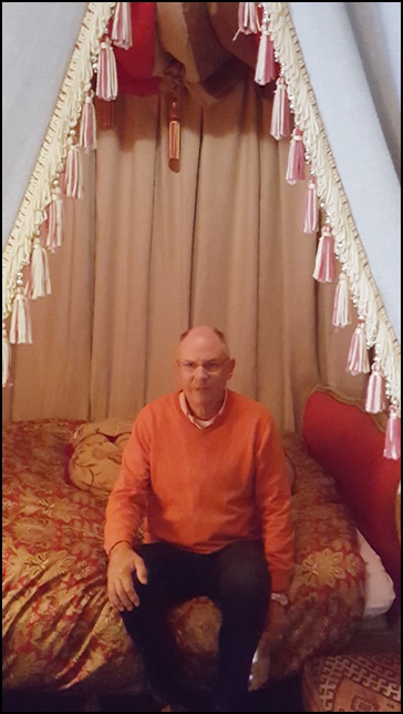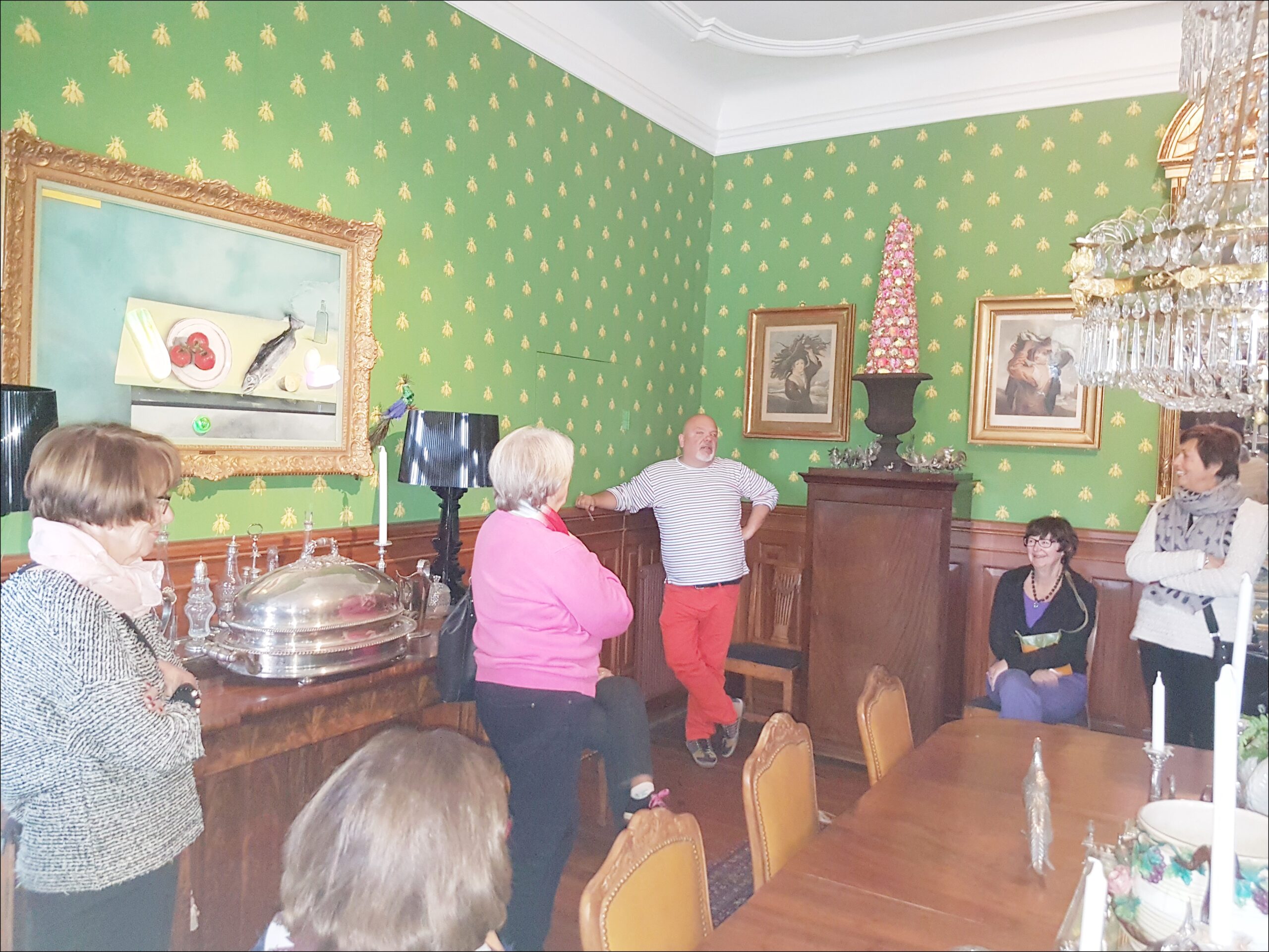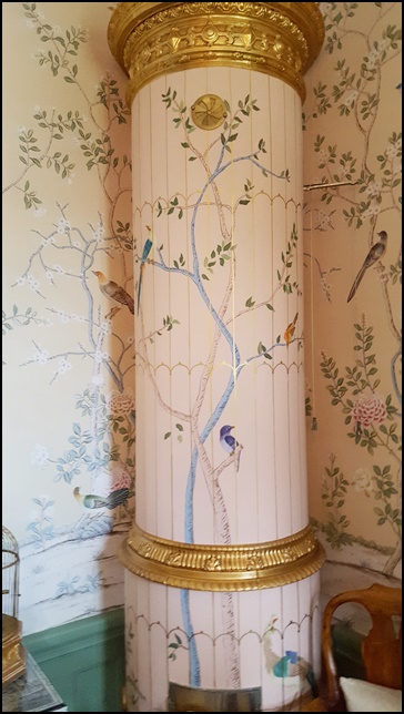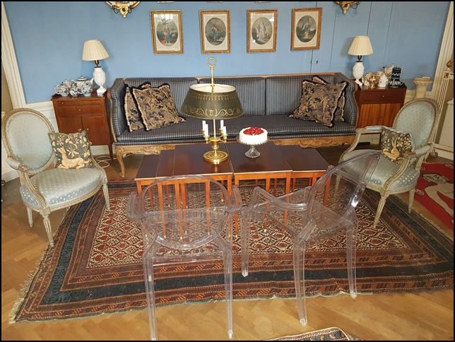 Joakim blandar olika tema, stilar, färger, tapeter och möbler samt prylar med stilfull säkerhet. Extra roligt var när han berättade om hur han fick köpa huset för 15 år sedan, samt hur han förvärvat olika möbler, letat speciella tapeter, ärvt från Moster Maja m.m. Joakim hade även en speciell trädgårdsvilstol som inte riktigt passade in, då inredde han ett speciellt trädgårdsrum för denna. Helt fantastiskt! Hans toalett var också en kopia av hans favorithotell i London, helt i viktoriansk stil.