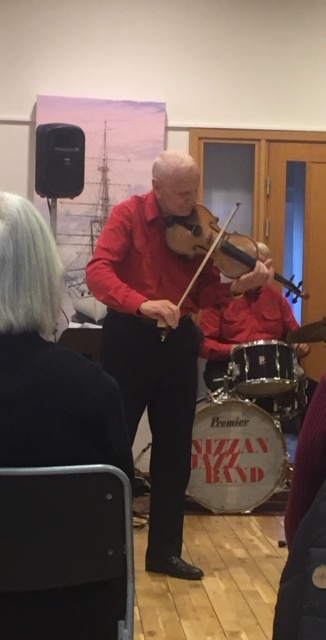 Efter denna fullödiga information lät Marianne alla blickar falla på dagens underhållare, NIZZAN JAZZVETERANERNA med Lasse Svensson på trumpet, fiol och sång, Boris Carlson banjo och sång, ”junioren” Jörgen Nielsen bakom keyboarden och trummisen Christer Francke. Gruppen bildades 1978 och firar i år 40-årsjubileum. Sedan starten har 3 musikanter gått ur tiden och ersatts med nya och senast då unge mr Jörgen. Jazzen har ju sitt ursprung i USA och storheter som Louis Armstrong , Bing Crosby och många New Orleansstjärnor finns ju med och präglar gruppens program. Under drygt en timme serverade NJ 15 underbara musikaliska utflykter i jazzens värld, se nedan, och gav den vältaliga publiken rik underhållning! Applådåskorna dånade!!