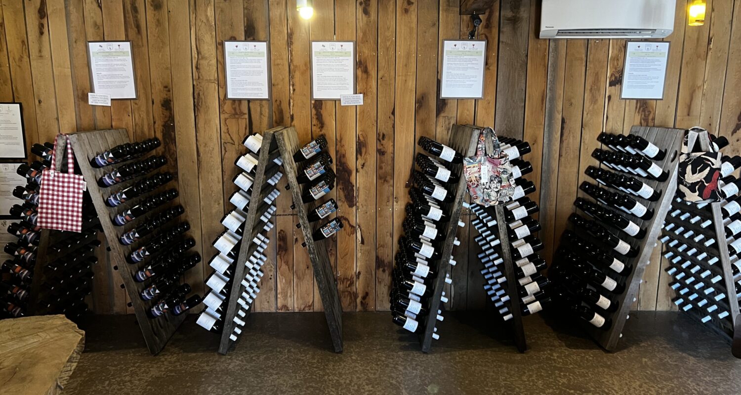 De är måna om att ha en så giftfri odling som möjligt. De utvidgar nu sin verksamhet med fler hotellrum. Anette visar oss vackra halmtak på de nya byggena. Vi ser också var vinet lagras.